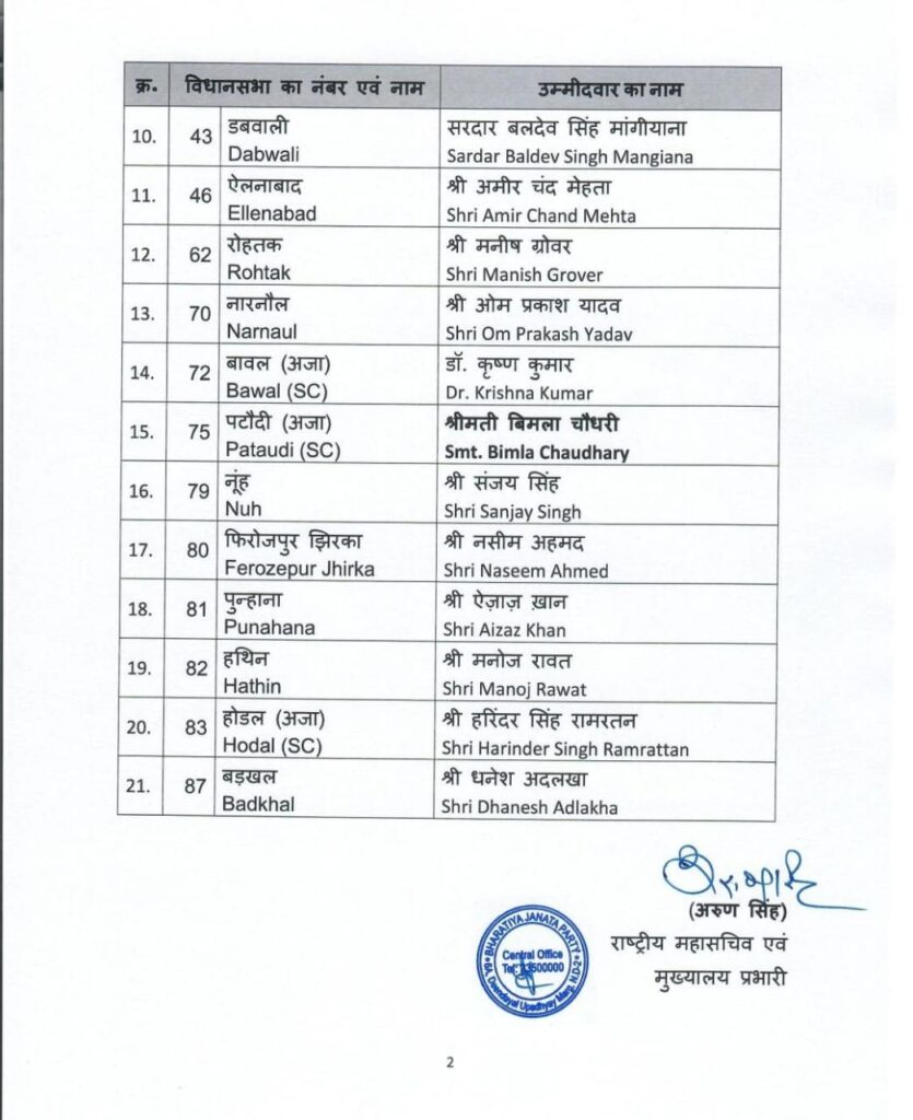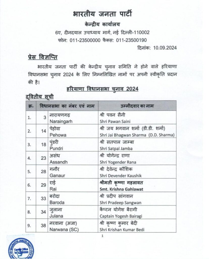 Haryana Assembly Election : हरियाणा विधानसभा चुनाव के लिए भारतीय जनता पार्टी (भाजपा) ने अपनी दूसरी सूची जारी कर दी है, जिसमें 21 उम्मीदवारों के नाम घोषित किए गए हैं। इस सूची में दो बड़े नेताओं—शिक्षा मंत्री सीमा त्रिखा और जनस्वास्थ्य मंत्री बनवारी लाल का टिकट कटना चर्चा का विषय बना हुआ है। इसके साथ ही, जुलाना सीट से कांग्रेस उम्मीदवार विनेश फोगाट के सामने भाजपा ने कैप्टन योगेश बैरागी को मैदान में उतारने का फैसला किया है।