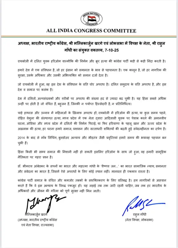 कांग्रेस अध्यक्ष खरगे और राहुल गांधी ने अपने बयान में कहा, “2014 के बाद से मॉब लिंचिंग, बुलडोजर न्याय और भीड़तंत्र हमारे समय की पहचान बन चुके हैं।” उन्होंने रायबरेली की घटना को संविधान के खिलाफ अपराध बताते हुए कहा कि ये सिर्फ दलित समुदाय पर हमला नहीं है, बल्कि पूरे समाज और देश के लिए शर्म की बात है।