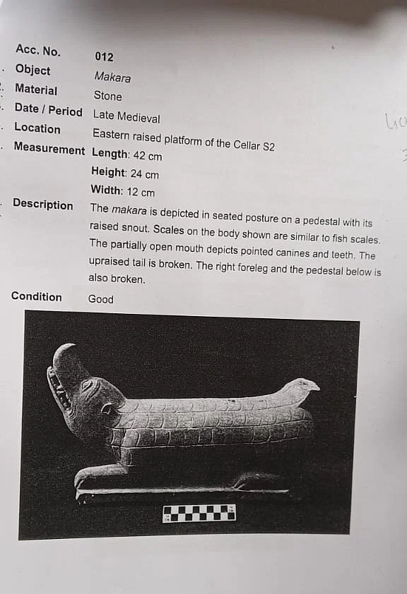 यह पत्थर से बनी मगरमच्छ के आकार की मूर्ति है, जिसकी लंबाई 42 सेंटीमीटर, ऊंचाई 24 सेंटीमीटर और चौड़ाई 12 सेंटीमीटर है। इसके शरीर पर मछली जैसे निशान बने हुए हैं, इसका मुँह खुला हुआ है और पूँछ टूटी हुई है।