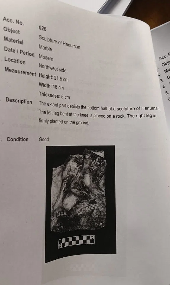 यह हनुमान की तीन भागों में बनी संगमरमर की मूर्ति है, जिसकी माप 36x23x2 सेंटीमीटर है। पहले भाग में हनुमान के सिर को मुकुट के साथ दिखाया गया है, दूसरे भाग में हनुमान को दाहिने हाथ में गदा पकड़े हुए दिखाया गया है (बाएं हाथ टूटा हुआ है), और तीसरे भाग में टूटा हुआ बायां पैर दिखाया गया है।
