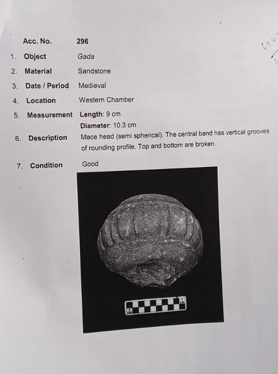 यह बलुआ पत्थर से बनी गदा है जिसका निचला भाग टूटा हुआ है। इसकी लंबाई नौ सेंटीमीटर और चौड़ाई 10.3 सेंटीमीटर है।