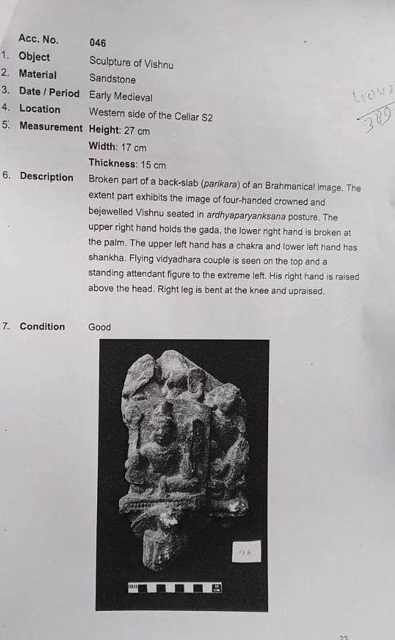 यह बलुआ पत्थर से बनी भगवान विष्णु की एक क्षतिग्रस्त मूर्ति है, जिसका आकार 27x17x15 सेंटीमीटर है। ऊपरी दाहिने हाथ में गदा है और निचला दाहिना हाथ टूटा हुआ है। ऊपरी बाएँ हाथ में चक्र है और निचले बाएँ हाथ में शंख है।