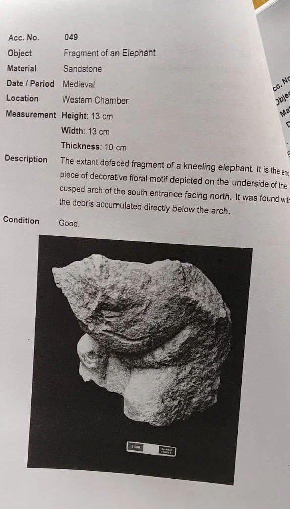 यह बलुआ पत्थर से बना हाथी के शरीर का एक हिस्सा है, जिसकी लंबाई और चौड़ाई 13×13 सेंटीमीटर और मोटाई 10 सेंटीमीटर है।