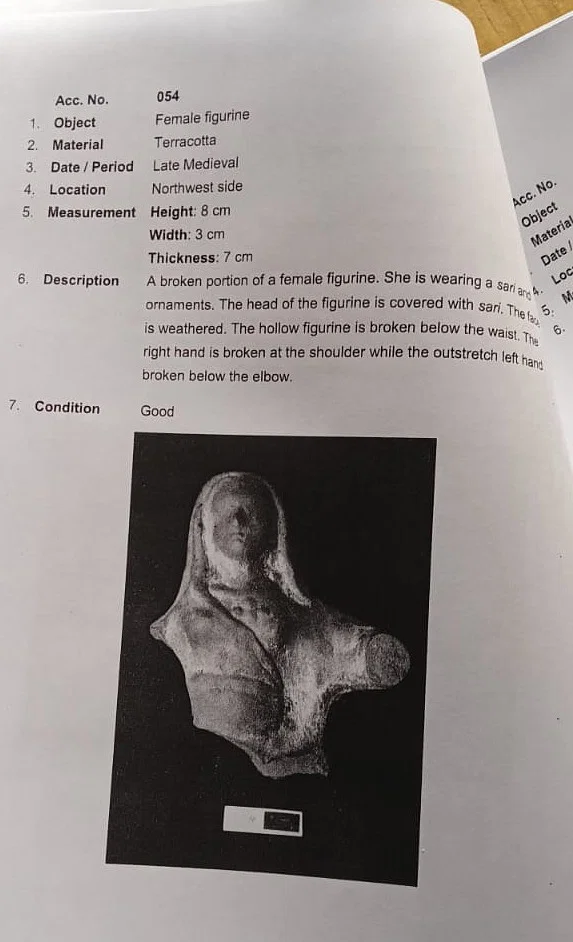 यह एक क्षतिग्रस्त मादा टेराकोटा मूर्ति है, जिसकी ऊंचाई आठ सेंटीमीटर, चौड़ाई तीन सेंटीमीटर और मोटाई सात सेंटीमीटर है। महिला को पल्लू लपेटे हुए साड़ी पहने हुए दिखाया गया है।