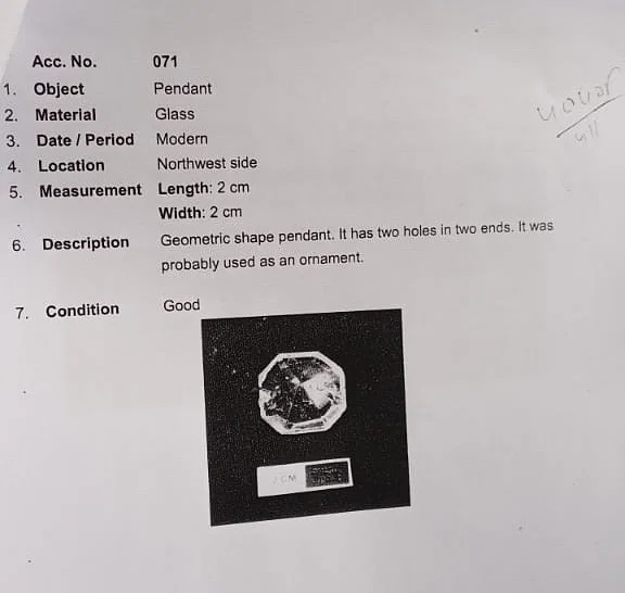 यह एक ग्लास पेंडेंट है, जिसे शैली में आधुनिक बताया गया है, इसकी लंबाई और चौड़ाई दो सेंटीमीटर है। इसके दोनों सिरों पर छेद के साथ एक ज्यामितीय आकार है।